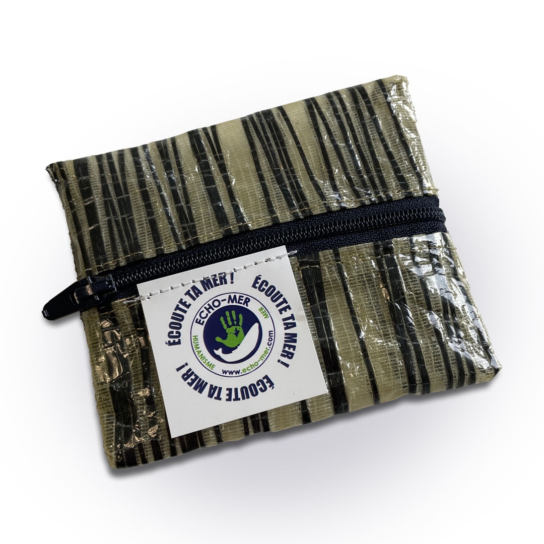 Petit porte-monnaie en voile mylar recyclée, finition métallisée or et noir. Compact, résistant et ultra-léger, matériau technique de régate, fabriqué en atelier solidaire pour un style unique.
