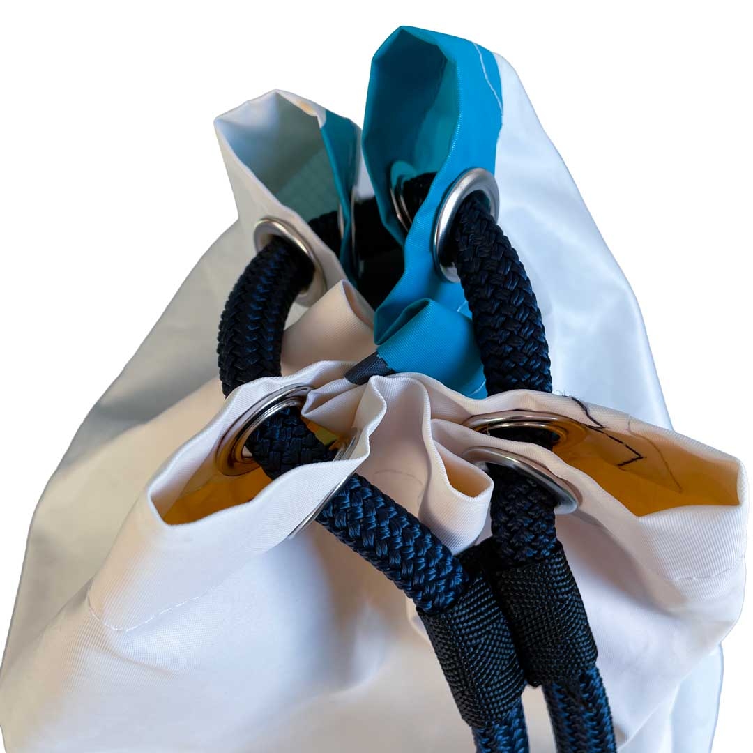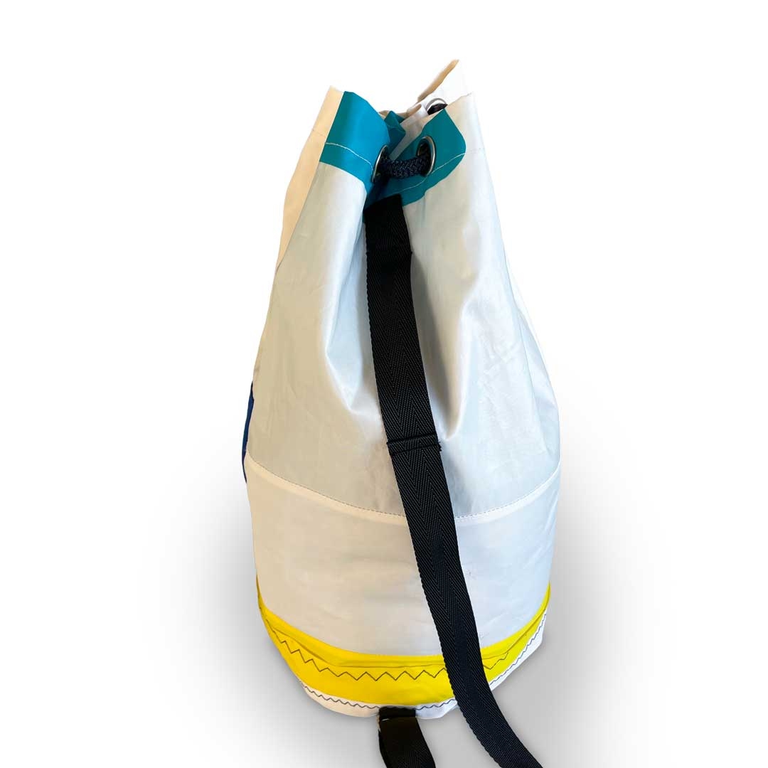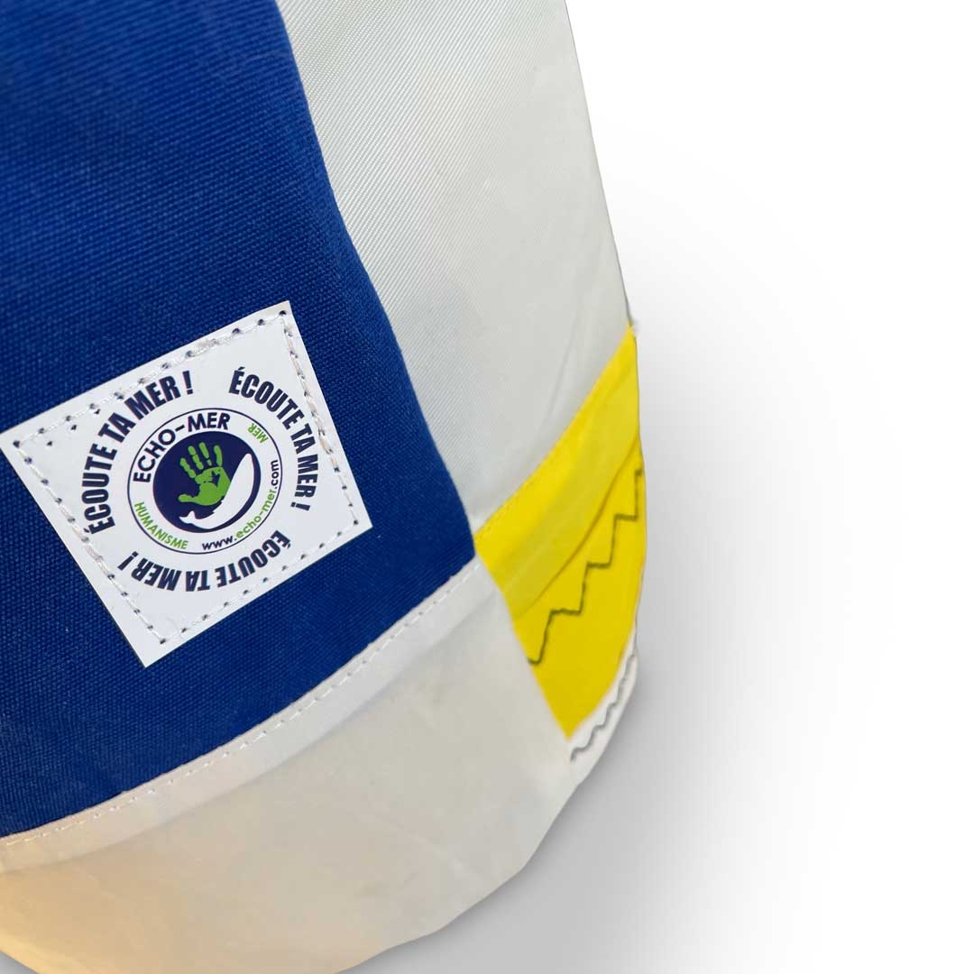 Sac matelot cylindrique petit format en voile recyclée multicolore. Doublure spinnaker avec poches, fermeture avec bout, bandoulière réglable. Le classic indémodable, fabriqué solidairement.