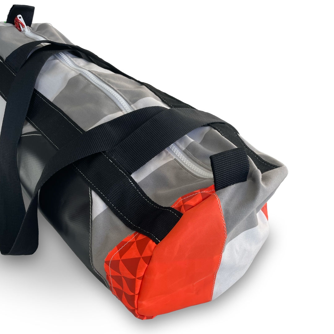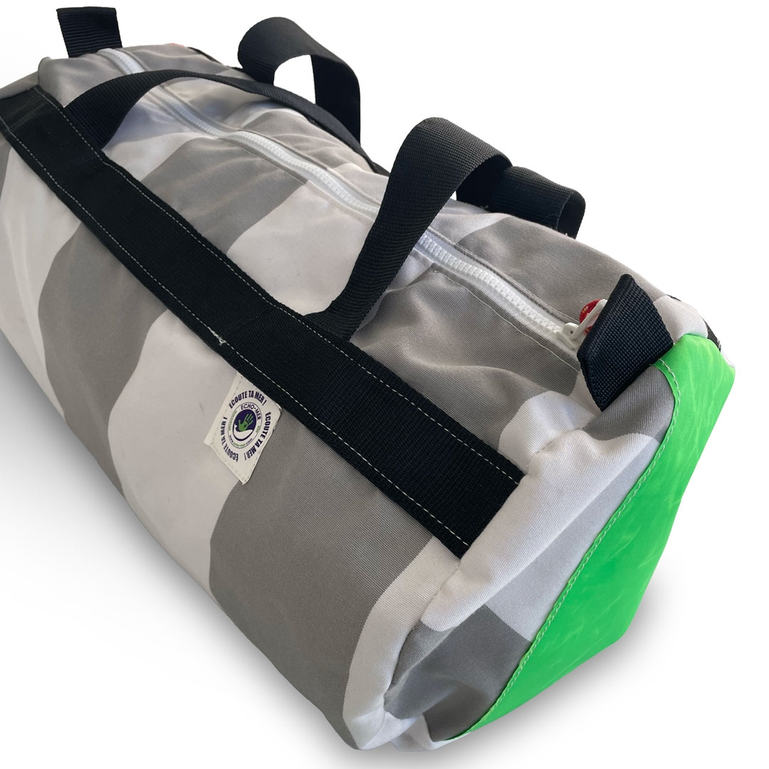 Sac de sport cylindrique en voile et bâche recyclées, design coloré blanc-gris avec touches rouge et vert. Résistant et esthétique, fabriqué en centre pénitentiaire pour la réinsertion professionnelle.